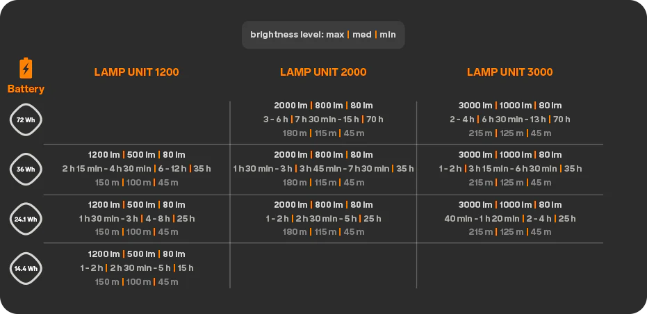 Included accessories | Lamp unit 2000 lm, Headband, 36 Wh battery, Extension cable 130 cm, Extension cable 40 cm, Top band, 2x Helmet bracket |