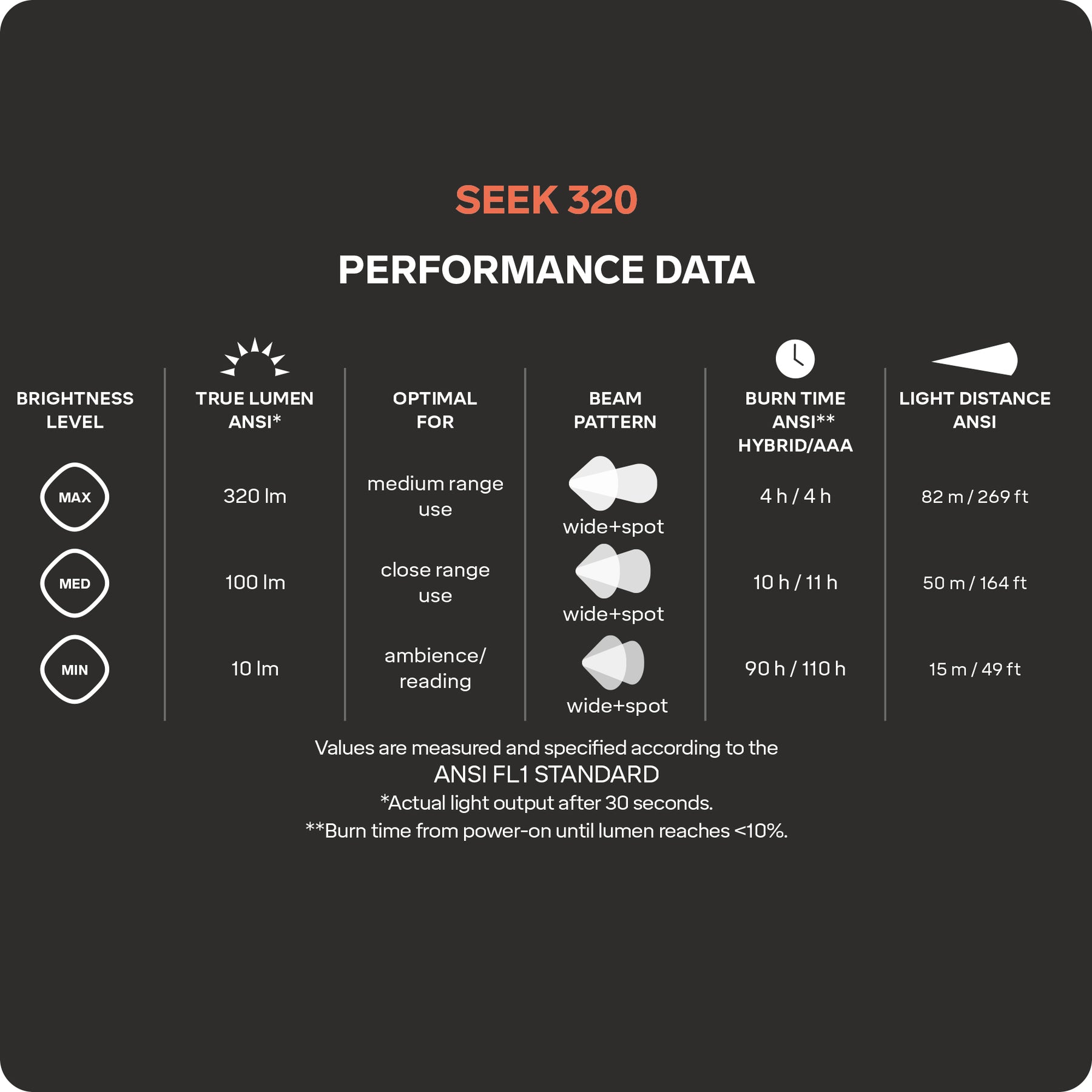 Max mode | 320 lm / 4 h burn time / 82 m (269 ft) light distance |