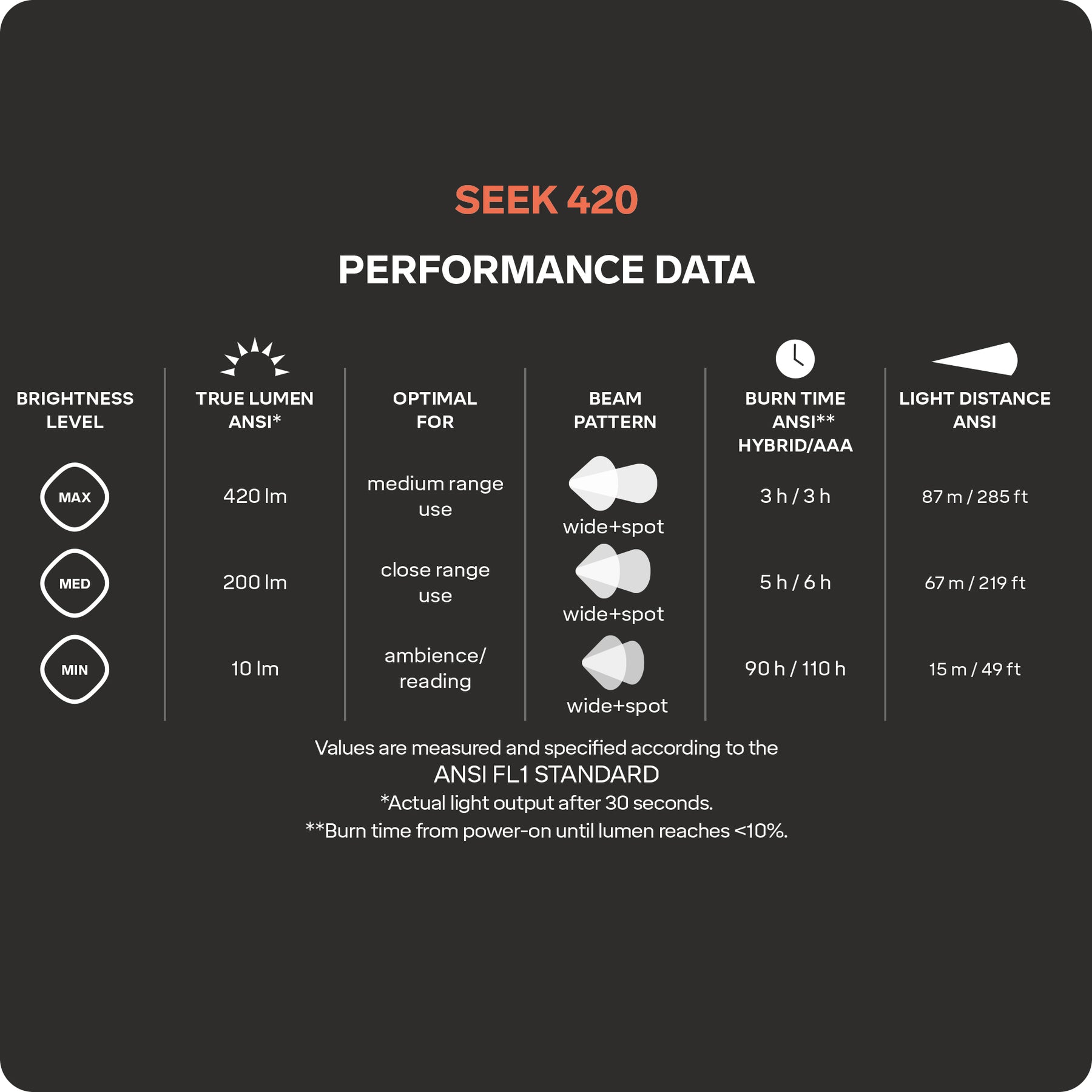 Seek 420 is a compact headlamp made for both everyday moments and epic adventures. With 420 lumens, recycled materials, and a detachable lamp unit, it’s always ready to light up everything from dog walks to summit hikes. A slim headband ensures a comfortable fit – and with Hybrid Technology, you can choose between rechargeable use or AAA batteries. Seek 420 also includes a red light mode for preserved night vision.
